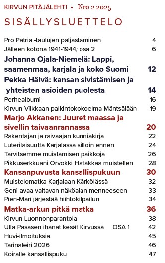 Seuraava lehti ilmestyy kesäkuussa 2026 ja siihen tarkoitetut jutut tulee lähettää 30.4.2026 mennessä os. kirvunkylat@kirvu.fi tai Hannele Inkinen, Puotilantie 1 I 49, 00910 Helsinki. Otamme mielihyvin vastaan muisteluksia Kirvun reissuilta, asettumisesta evakkopaikoille, muistokirjoituksia, ilmoituksia ja onnitteluja.